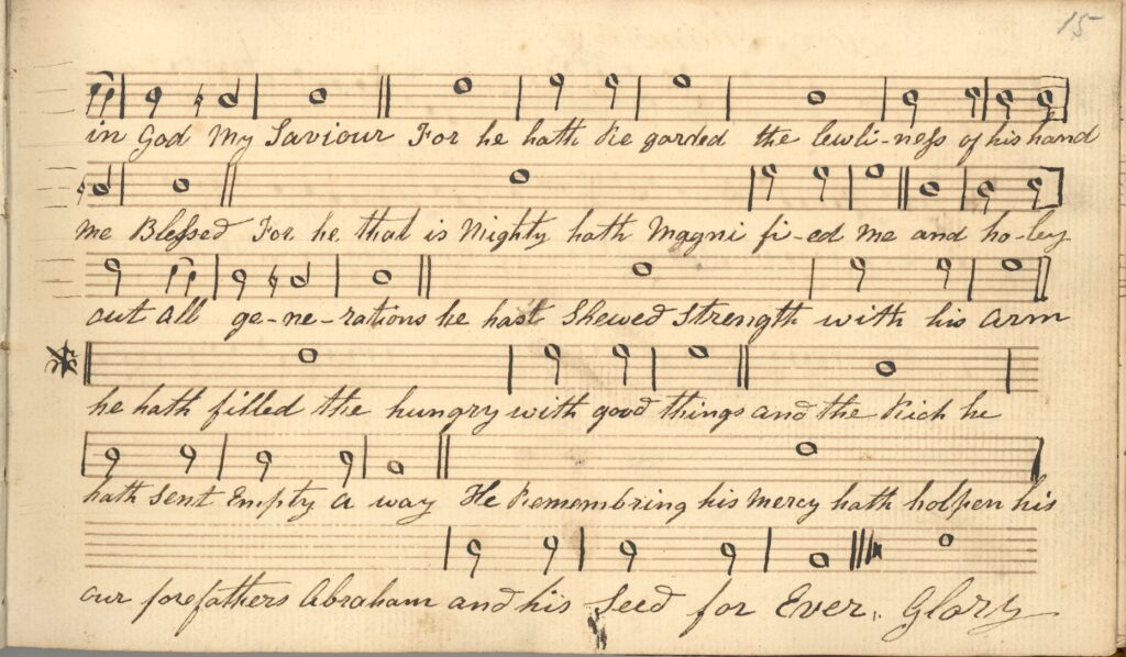 From page 6 to page 13 dance tunes appear to be written in the same hand. Page 14 is the start of the inclusion of sacred music in the manuscript. ‘Personally, I doubt that JB also wrote page 14 (Magnificat), though there is a return to a more disciplined writing style reminiscent of JB’.