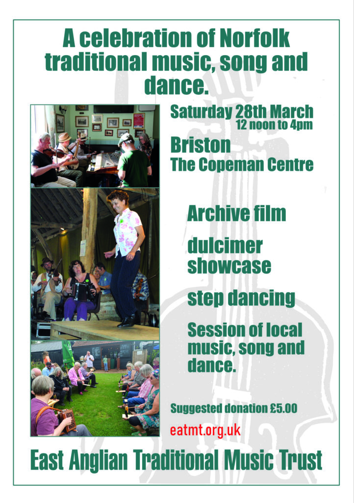 In the twentieth century, many recordings were made and published – particularly of melodeon and fiddle players- from the eastern counties. The earlier collectors had perhaps not paid as much attention to instrumental music as to song, perhaps because this was functional music, to accompany dancing – either social dancing (“country” dancing) or step dancing. Some tunes are hundreds of years old, many date from the nineteenth century, and even more recent song tunes were absorbed into the traditional repertoire in the twentieth century. Typical tune types are hornpipes, schottisches and waltzes, with a few jigs. Instrumentation was typically melodeon (from the 1840s) fiddle or dulcimer. The latter instrument had a distinctive regional style, popular between 1850-1930.