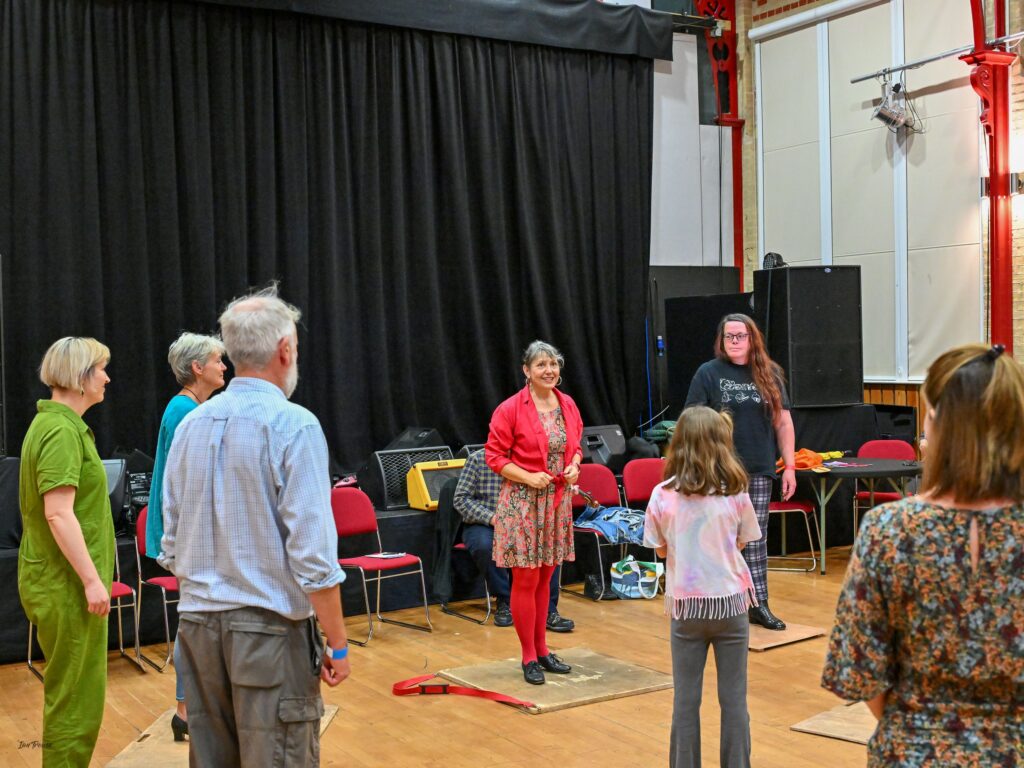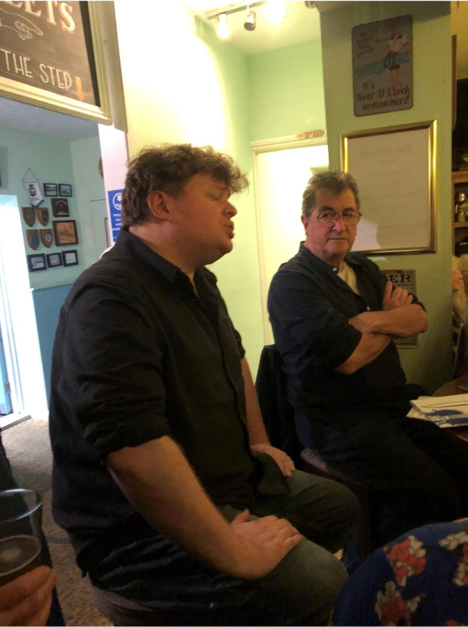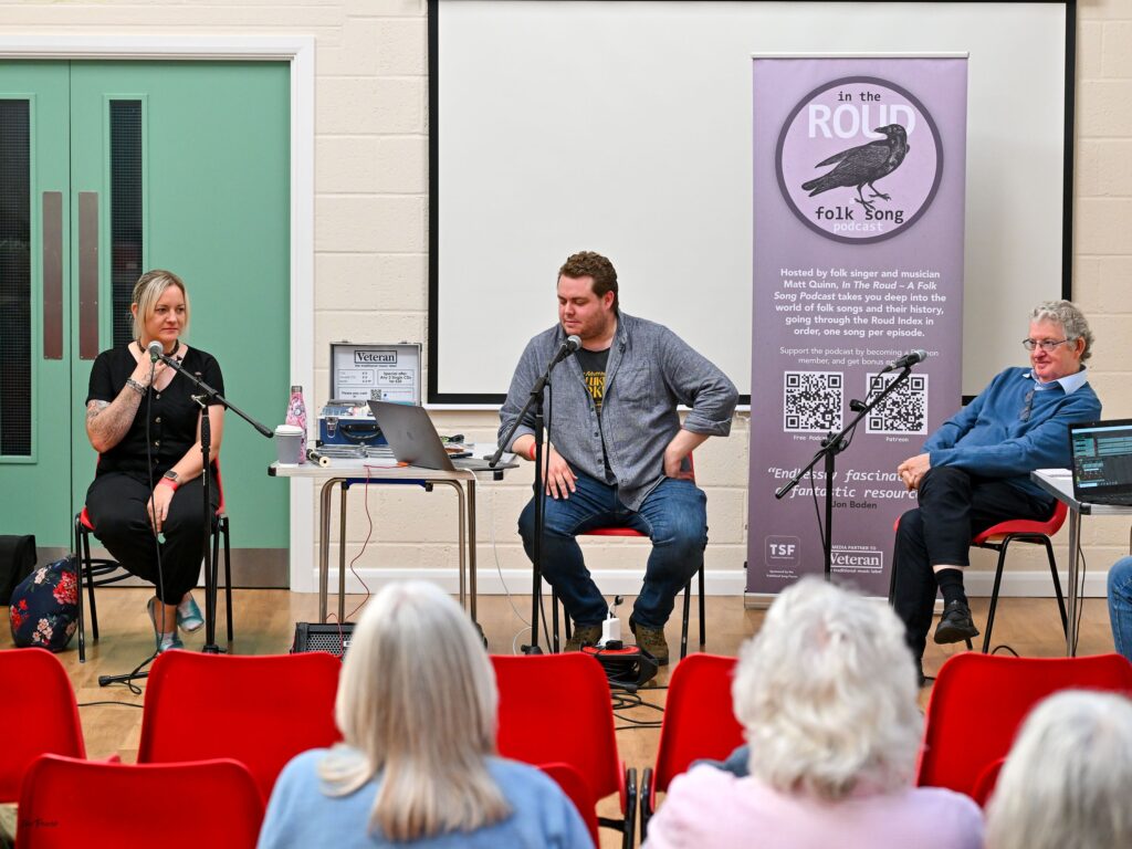 The afternoon progressed with fine performances by the Scan Tester Fan Club and Georgia Shackleton and the first live podcast of “in The Roud” hosted by Matt Quinn with folklore expert Steve Roud and Essex singers Belinda Kempster and Fran Foote. There were plenty of chances to take part, with community sessions including Bollywood Dancing, a Big Sing, and Country Dancing. and Have a Go opportunities on Concertina, Melodeon and Dulcimer. James Delarre and Saul Rose led a vibrant session in 11 Market Place and The Old Timers String Band from Norwich played “Traditional Music from Both Sides of the Atlantic” to an enthusiastic local audience in the Royal William. John Row wandered around the town with his unique brand of storytelling and Hazel Marsh hosted an engaging exhibition about Romani and Traveler Singers. The highlight for many was Macdara Yeates entertaining the biggest audience of the day in the British Legion with his riveting traditional songs from Dublin.