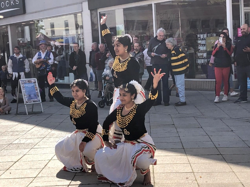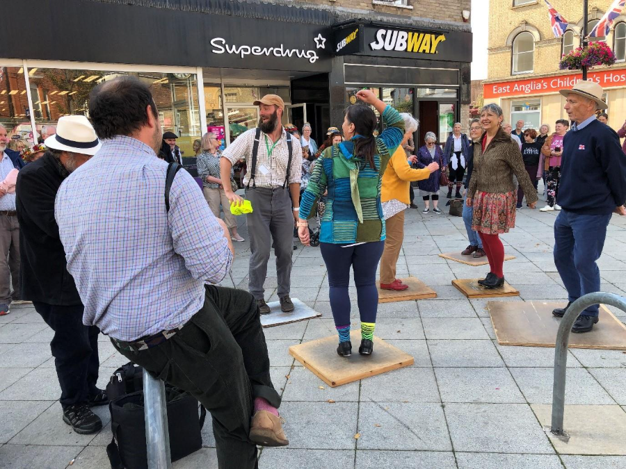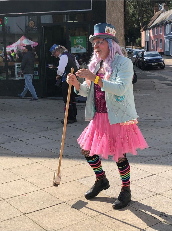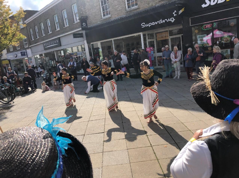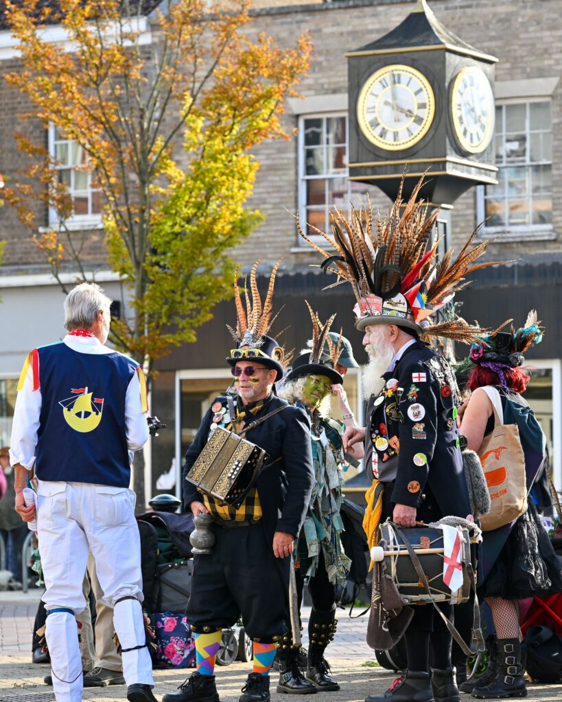 More than a dozen Morris teams from across East Anglia and dancers from Kerala Community Supplementary School entertained towns people and visitors at five dance spots around the town and a Stepdancing Showcase, led by Fiona Davies and Kerry Fletcher held a sizeable crowd in the Market Place. Local performers, programmed by Peter Booth, sang and played through the day in the Old Fox Yard.