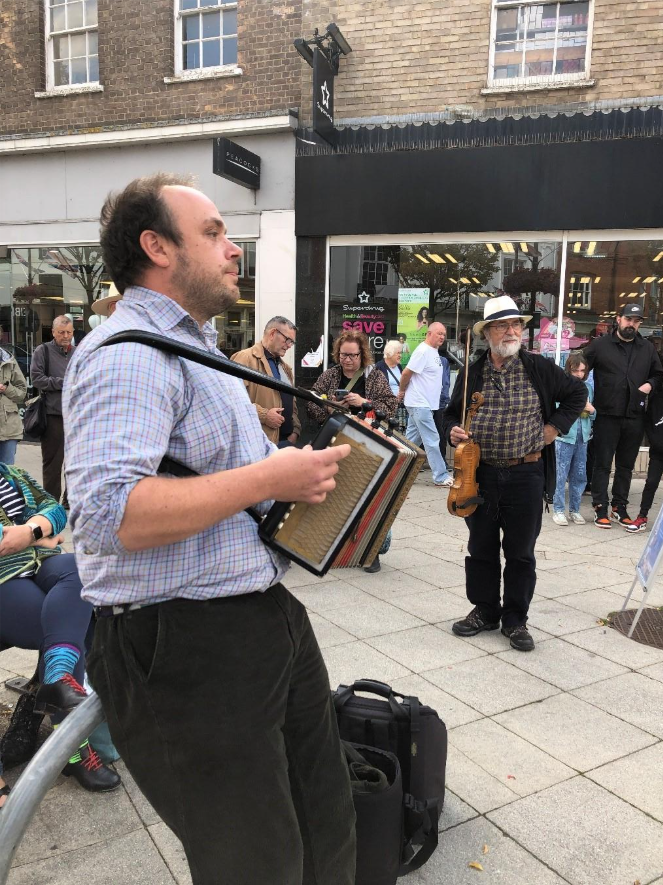 So, a great day, marred only by the smoke from a fierce fire in the town. Thanks to all the performers, MCs, ticket buyers and particularly our valiant volunteers, within whom the day would be impossible. Make a note in your 2026 diary. Saturday September 19th, when Stowmarket will again be full of traditional music, song and dance.